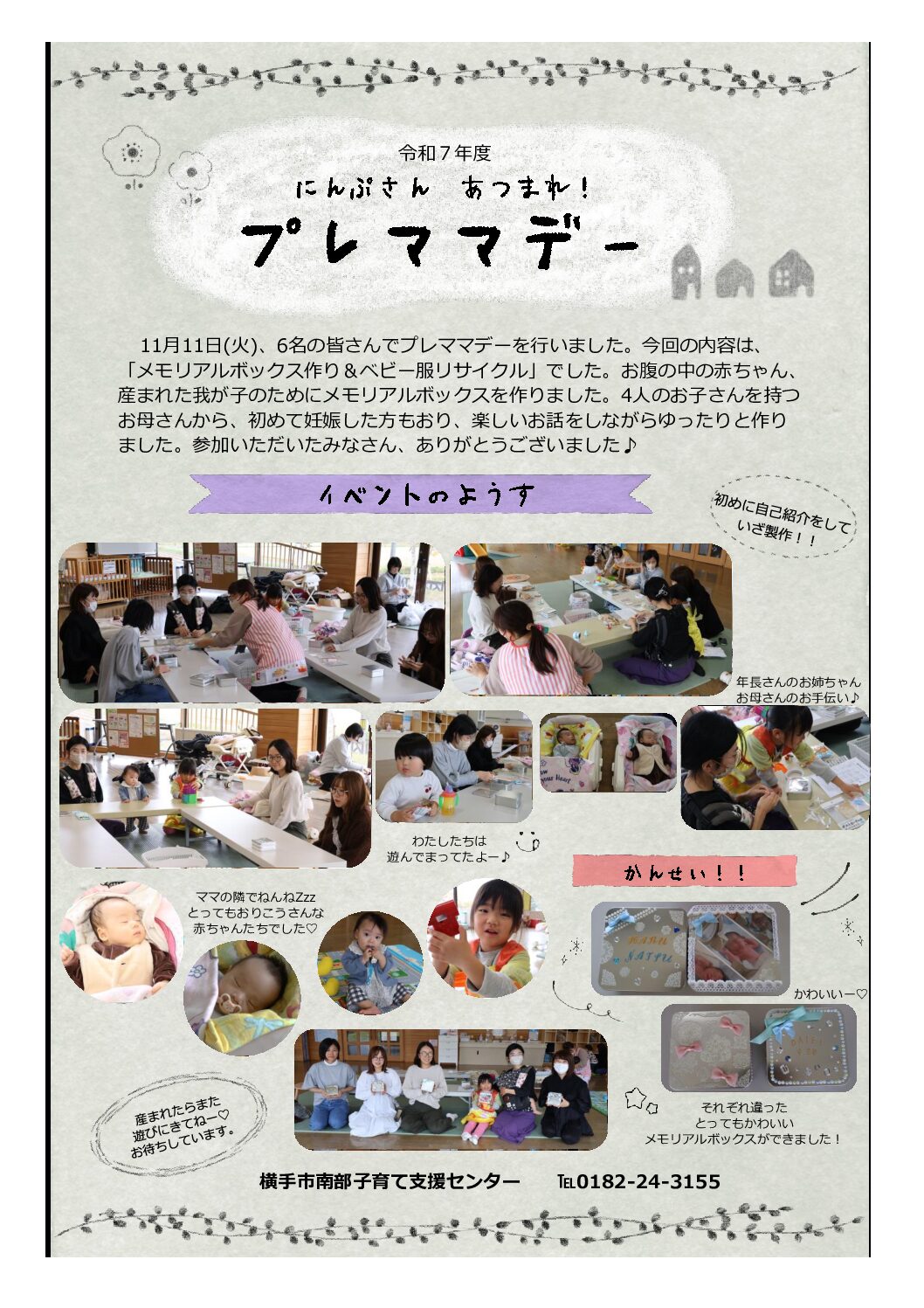 みなさん こんにちは 『南部子育て支援センター』では11月11日 (火) に「プレママデー・メモリアルボックス作り&ベビー服リサイクル」を開催しました 詳しい内容は、活動の様子 をご覧ください お問い合わ… 続きを読む »