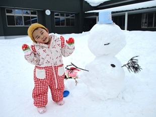 ちょうどお子さんと同じくらいの大きさのかわいい雪だるまが完成しました![]()