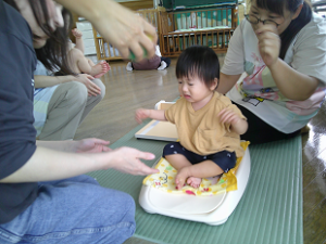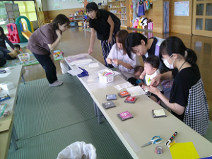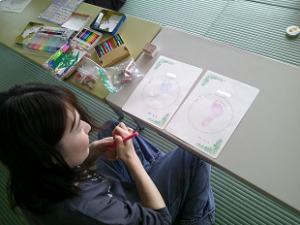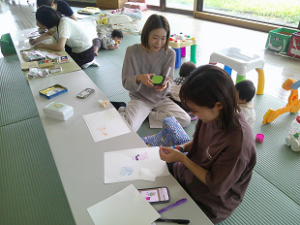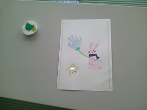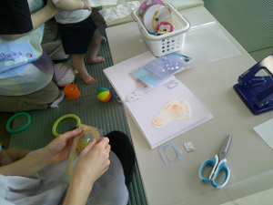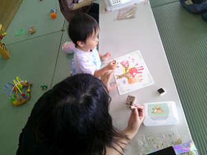 その後、お母さん達が手型や足型を動物に見立てて絵を描いたり、シールを貼ったり思い思いの作品が出来上がりました。