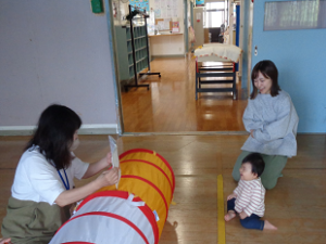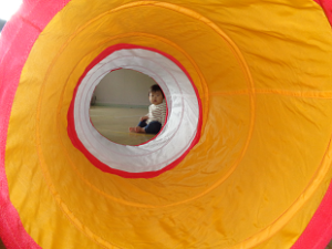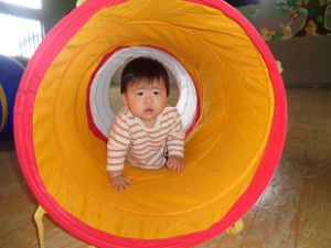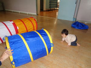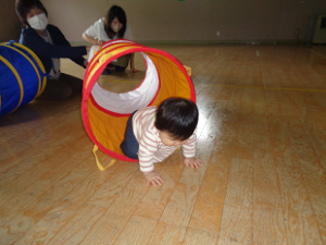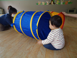 体育館に移動をし、トンネルで遊びました上手にくぐり抜けていましたよ。