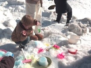 みんなで、雪を丸めたり、色水あそびをしたり、型にはめたり、お尻滑りをしたりして、思い思いに雪の感触を楽しみました。